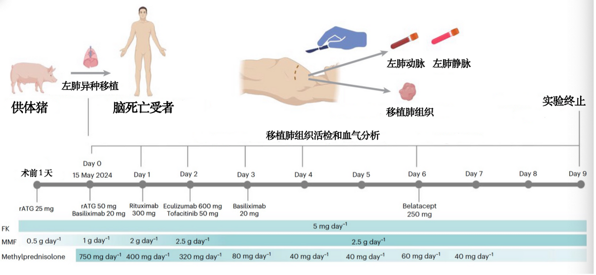 猪肺-人异种器官移植实验流程示意图,包含免疫抑制方案。在时间轴上方的示意图中,取自基因编辑供体猪(GTKO/B4GalNT2KO/CMAHKO/CD55/CD46/TBM)的左肺被异种移植到脑死亡受体体内,随后从吻合后的左肺动脉(LPA)和左肺静脉(LPV)进行肺活检与血气采样。