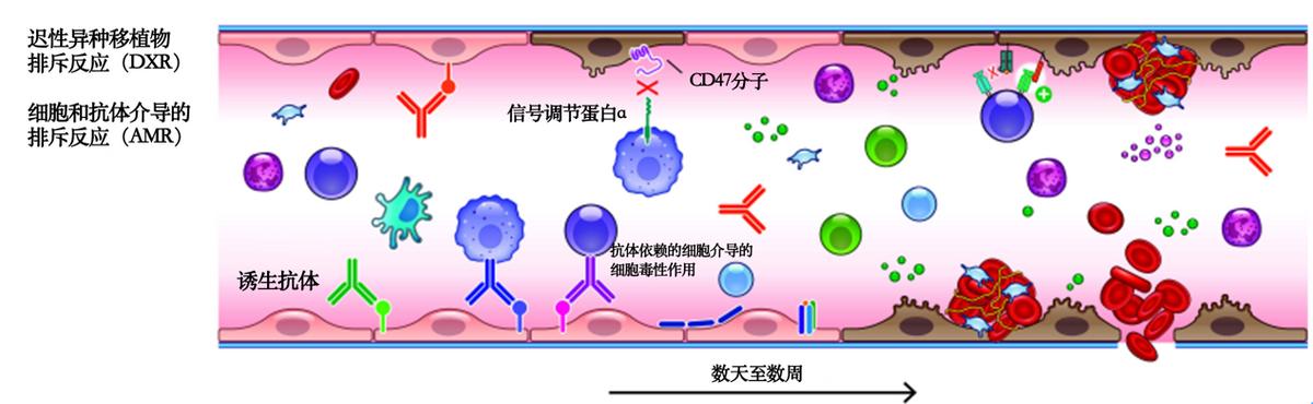 超急性排斥(HAR,hyperacute rejection):受体血液中预存的抗猪抗体识别移植物血管内皮细胞抗原并激活补体,导致炎症、间质出血、内皮损伤、血栓形成和缺血,从而快速破坏移植物。