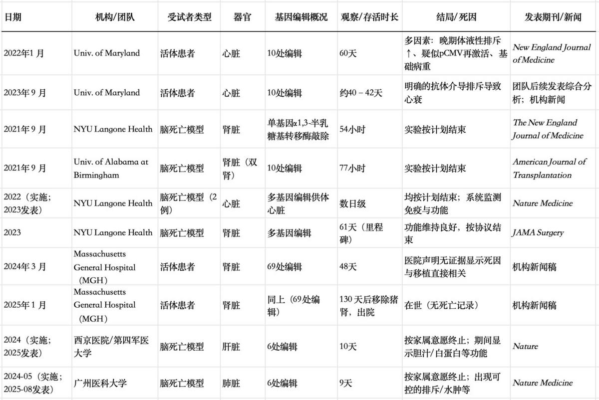 猪-人异种器官移植主要临床案例