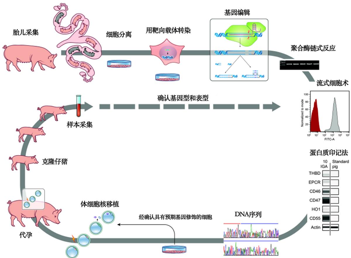 基因编辑猪的制备流程:从中期胎儿中分离成纤维细胞,培养后转入基因打靶载体进行编辑。通过PCR和DNA测序筛选基因型,并结合Western blot和流式细胞术检测蛋白表达或缺失。获得目标基因型和表型的细胞用于体细胞核移植(SCNT),生成克隆猪仔。经基因型和表型确认的猪仔可再次提供细胞用于后续多轮基因工程改造。