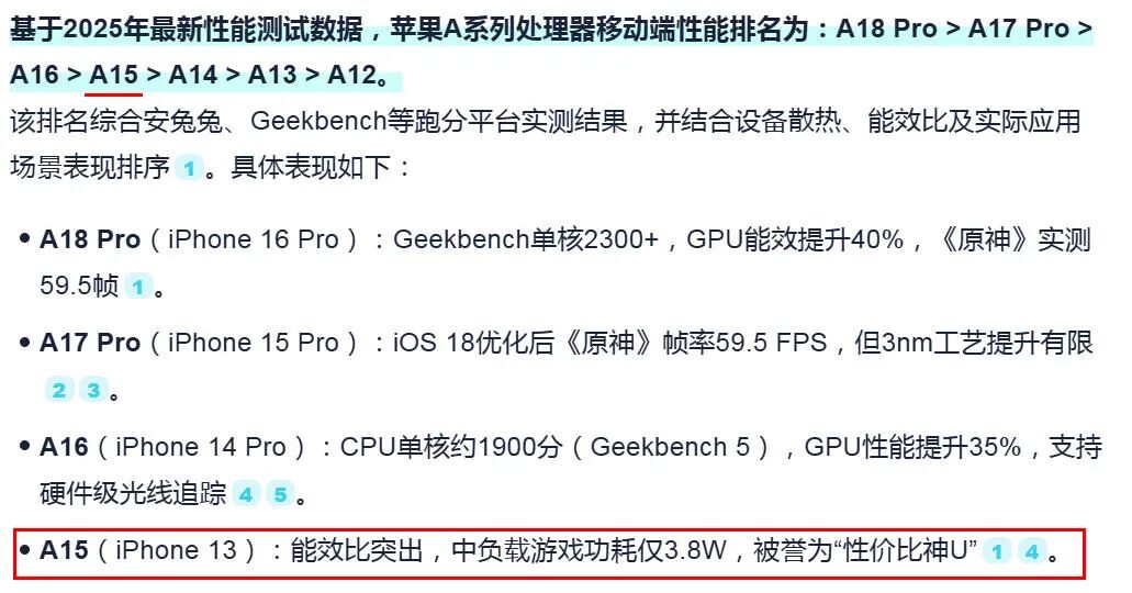 上面这个排名是我让AI生成的,还是不够聪明,漏掉了A19处理器。有人会说iPhone13不也用A15么?干嘛还买14?理由是iPhone14内存从4GB升到了6GB,不得不服厨子的刀法精准。