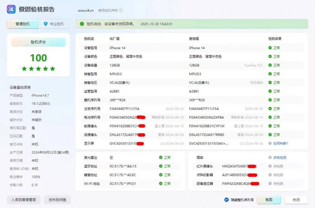 买二手iPhone14还要注意有没有拆机,可以观察底部两个螺丝的痕迹,如果只是换过电池就能接受,毕竟三年前的老机器了。但如果电池健康度很低(说明没换过电池),机器却还拆过,就需要结合爱思助手去综合判定了。