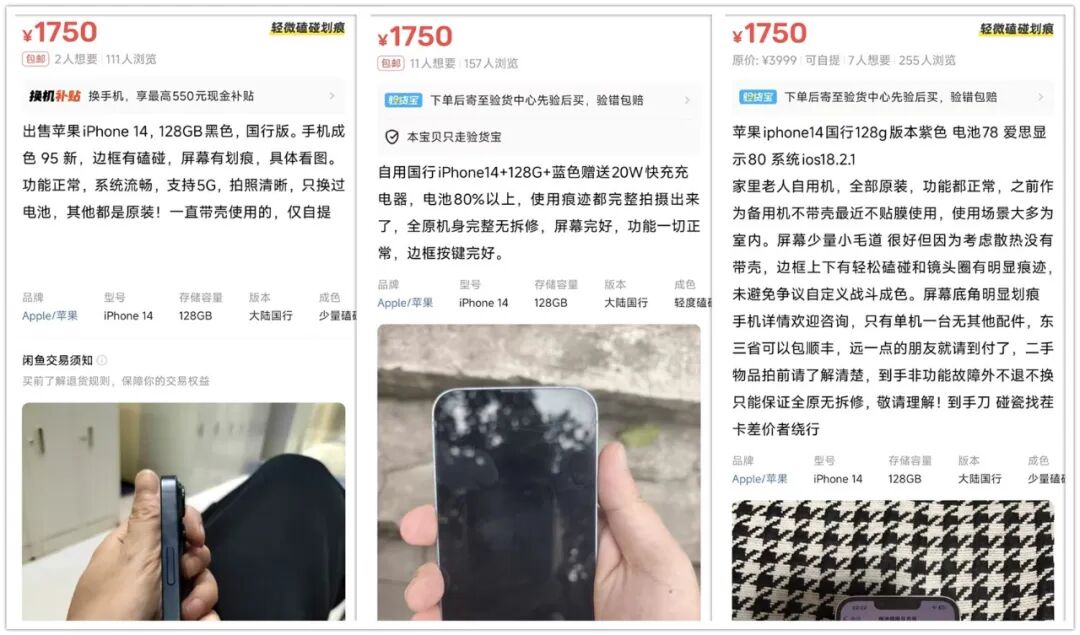 但要注意二手iPhone14充斥着大量换屏机,肉眼识别方法是底部下巴更大,这是换了比较差的外屏玻璃或总成所致。现在还有国产LCD屏幕总成替换,某宝单屏零件均价150元左右,比OLED屏幕总成便宜一半,会丢原彩,需要小心识别。