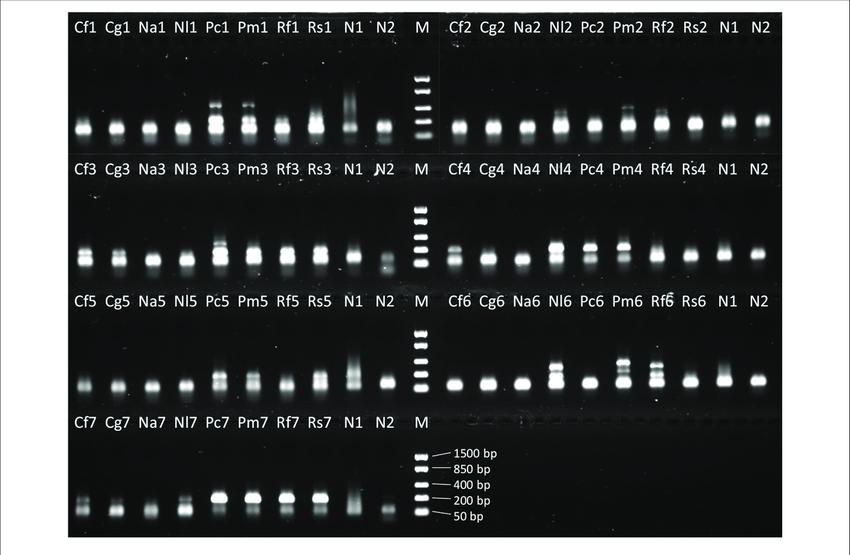 1985年样品在第二轮PCR中七种引物组合扩增产物的凝胶电泳图像