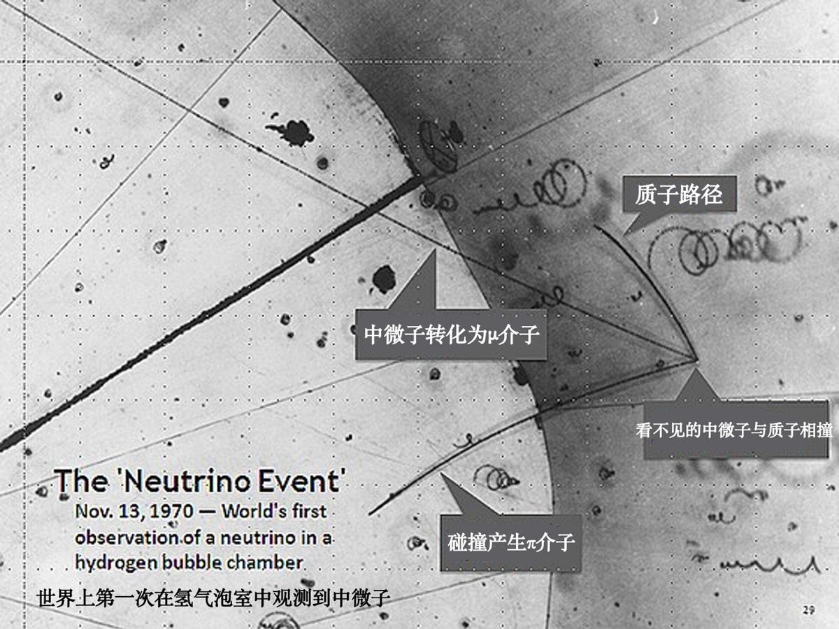 1970年11月13日,弗雷德·雷恩斯(Fred Reines)和克莱德·考恩(Clyde Cowan)在阿贡国家实验室首次使用氢气泡室探测中微子。其中,中微子撞击氢原子中的质子,碰撞发生在照片右侧发出三条轨道的点。
