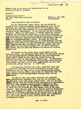 1930年12月,沃尔夫冈·泡利给“亲爱的放射性女士们先生们”写了一封著名的信件。