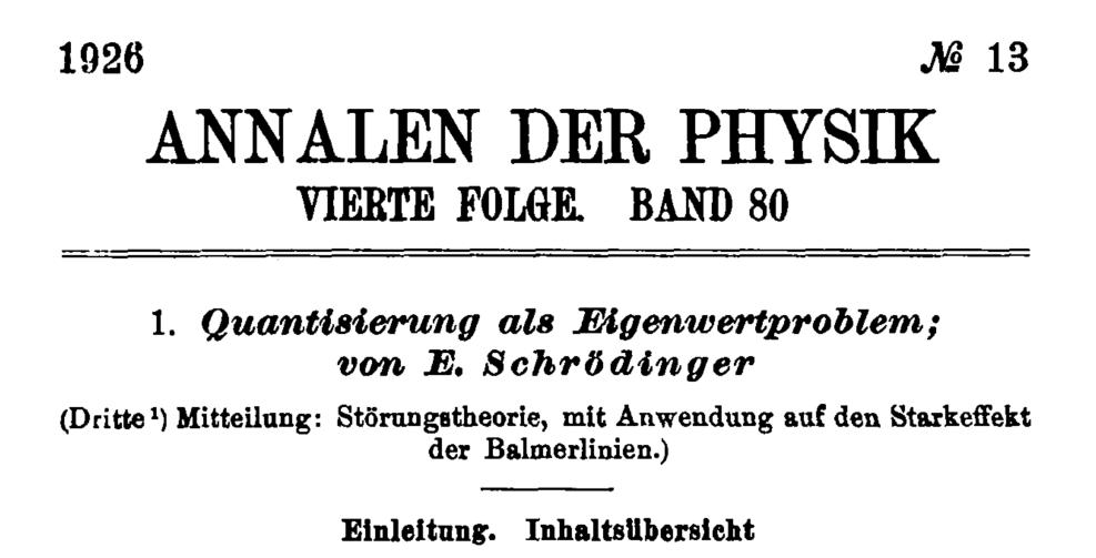 1926年1月至6月,被科学史家称为“薛定谔的奇迹半年”。在此期间,他连续发表了四篇论文,总题为《作为本征值问题的量子化》(Quantisierung als Eigenwertproblem)。在第一篇论文中,他提出了那个改变物理学的方程: