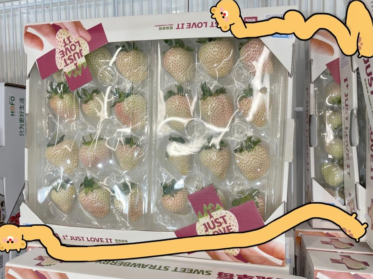 悠悠自己在一边等爷爷挑水果,可身边较为低矮的货架上,放着几盒夹着乌梅条的白草莓。