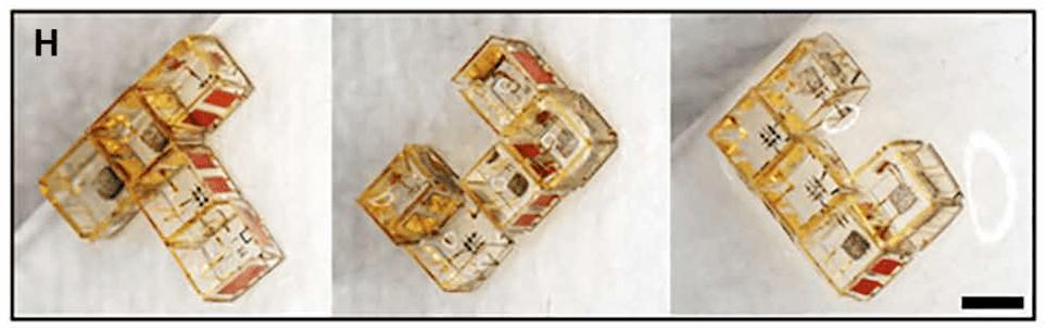 折纸灵感+硅芯片=会自己“叠”出来的机器人这项近期发表在《科学·机器人学》期刊上的研究成果,来自开姆尼茨工业大学材料、架构和纳米膜集成研究中心(MAIN)的科研团队。研究人员从折纸艺术中获得灵感,让原本是平面的电子系统能够自主卷曲并折叠成中空的微型立方体。每个微智宝的边长仅有约1毫米,却集成了太阳能收集器、计算单元、光信号系统等多种功能组件。