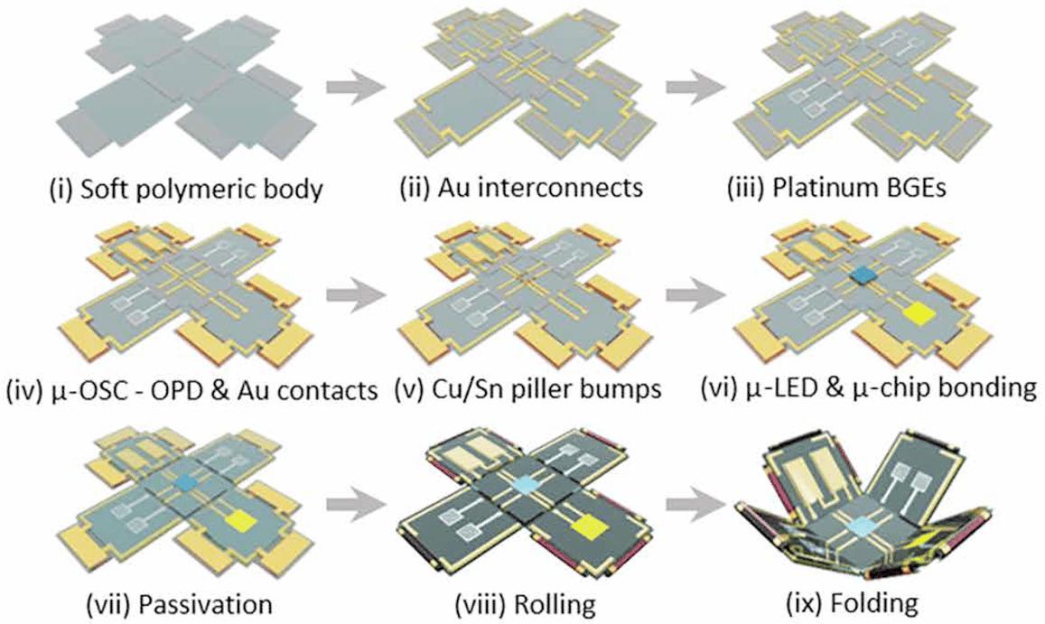步骤包括:(i) 创建软质聚合物主体;(ii) 金互连层;(iii) 沉积用于气泡发生器(BGEs)的铂和镍;(iv) 微型有机太阳能电池(μ-OSC)和微型有机光电二极管(μ-OPD)制造的中间步骤,包括阳极、电子传输层、光活性聚合物、空穴传输层和金接触层;(v) 制备铜/锡凸点;(vi) 键合微型LED和硅微芯片;(vii) 在刚性面上选择性涂覆SU-8聚合物钝化层;(viii) 卷曲微型有机太阳能电池;最后 (ix) 自组装折叠成立方体。
