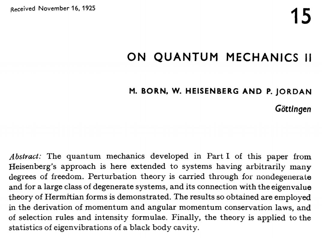 1925年,以玻恩和约旦署名的论文《Zur quantenmechanik》发表,这篇在玻恩主导下完成的论文,首次系统地将矩阵确立为量子力学的基本数学工具,清晰地阐述了矩阵运算规则(特别是非交换的乘法),并开始将位置、动量等物理量表示为矩阵。