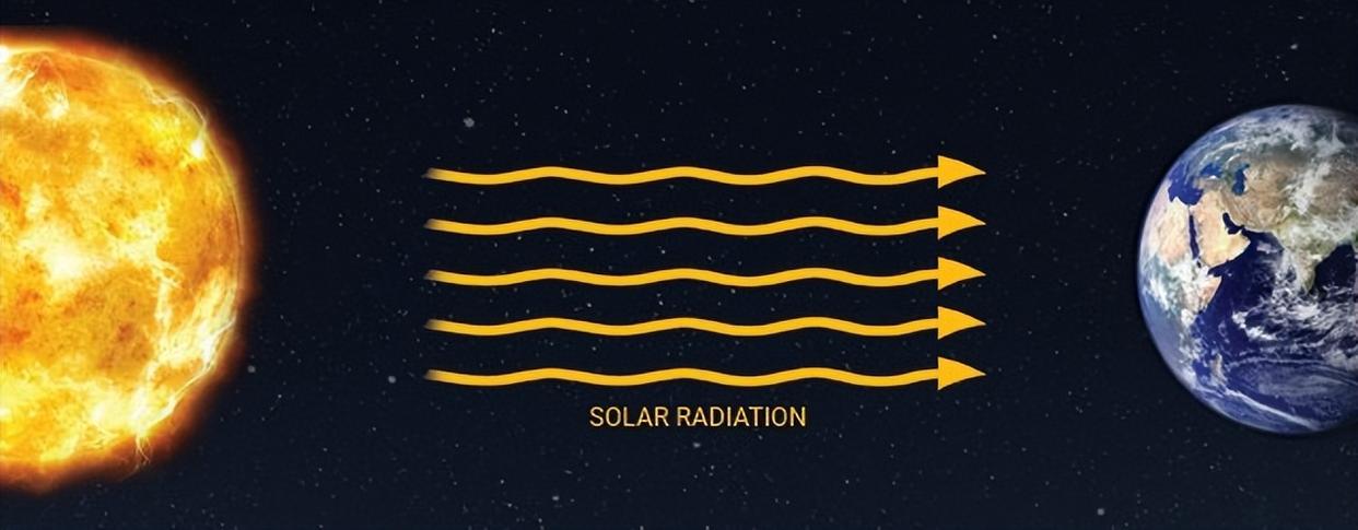 太阳辐射源于太阳上一直发生的核聚变反应,这些能量主要以电磁波的方式向宇宙空间发射,理论上可遍布太阳系,其中主要为红外辐射、可见光和紫外辐射,当然还有极少部分是X射线、极紫外等。其中,可见光和部分红外、紫外可抵达地面,极紫外还有X射线等会被大气层吸收。这些电磁波与地球上的粒子发生相互作用,比如照射到物体表面时,可增加粒子的动能,导致粒子运动速度加快,这种运动的增强所引发的结果就是温度变化。