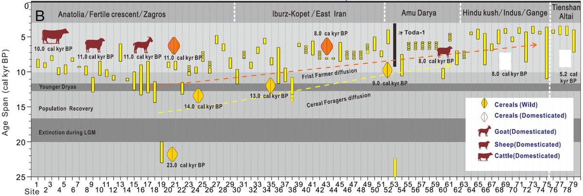 从西亚向东方传播的古代谷物采集者的时间线。通过编号遗址的年代跨度条显示采集者的扩散时间线,虚线条表示推测年代,并标注了各地区野生/驯化谷物及家养动物的证据。