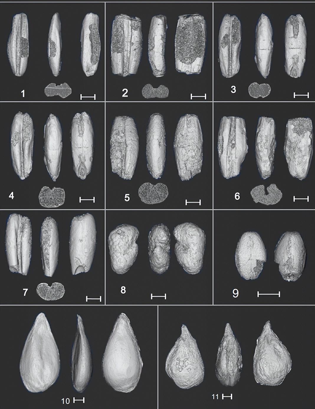 通过CT扫描技术,研究团队对每一粒炭化种子进行了三维重建。结果显示,大部分谷粒呈现出典型的野生二棱大麦特征:狭窄对称的外形、宽阔的腹沟和棱角分明的横截面。然而,少数谷粒展现出了向驯化形态过渡的特征,如更圆润的背部轮廓和较少的横向条纹。