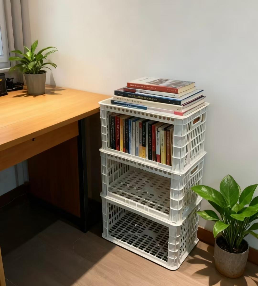 老妈把剩下的筐子也按照同样的方法开口、叠放、扎紧,然后放到书桌旁,一个简易书架就好了。