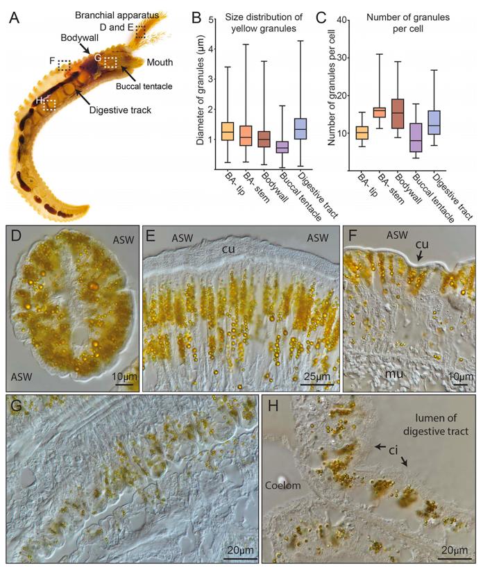 在鳃丝尖端,黄色颗粒的平均直径为1.29微米;在体壁表皮细胞中为1.04微米;而在口触手中的颗粒较小,平均直径仅0.77微米。有趣的是,所有含有这些颗粒的细胞都直接与海水接触,而且颗粒总是聚集在靠近海水一侧的细胞质中。