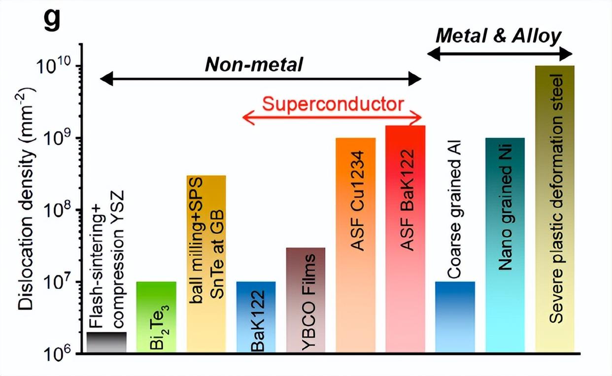 通过非对称应力场工艺处理的BaK122的位错密度(ρD),与各种非金属和金属体系的比较。