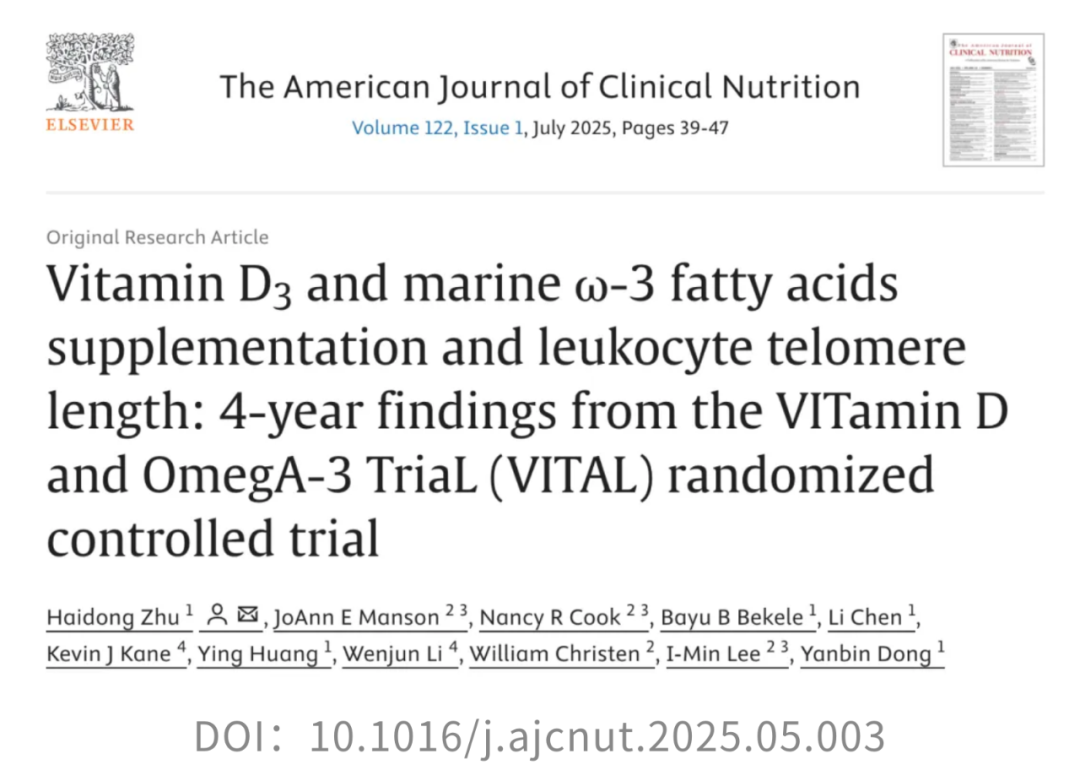 [2]Zhu H, Manson JE, Cook NR, Bekele BB, Chen L, Kane KJ, Huang Y, Li W, Christen W, Lee IM, Dong Y. Vitamin D3 and marine ω-3 fatty acids supplementation and leukocyte telomere length: 4-year findings from the VITamin D and OmegA-3 TriaL (VITAL) randomized controlled trial. Am J Clin Nutr. 2025 Jul;122(1):39-47. doi: 10.1016/j.ajcnut.2025.05.003. Epub 2025 May 21. PMID: 40409468; PMCID: PMC12308094.