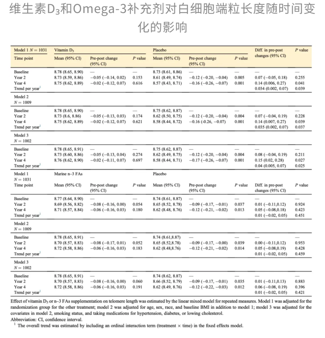 相比之下,Omega-3的表现却不是那么亮眼。无论是在第2年还是第4年,Omega-3组与安慰剂组在LTL变化上都没有显著差异。