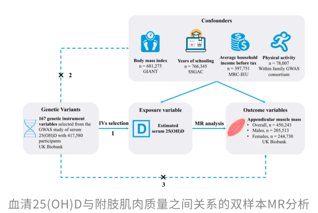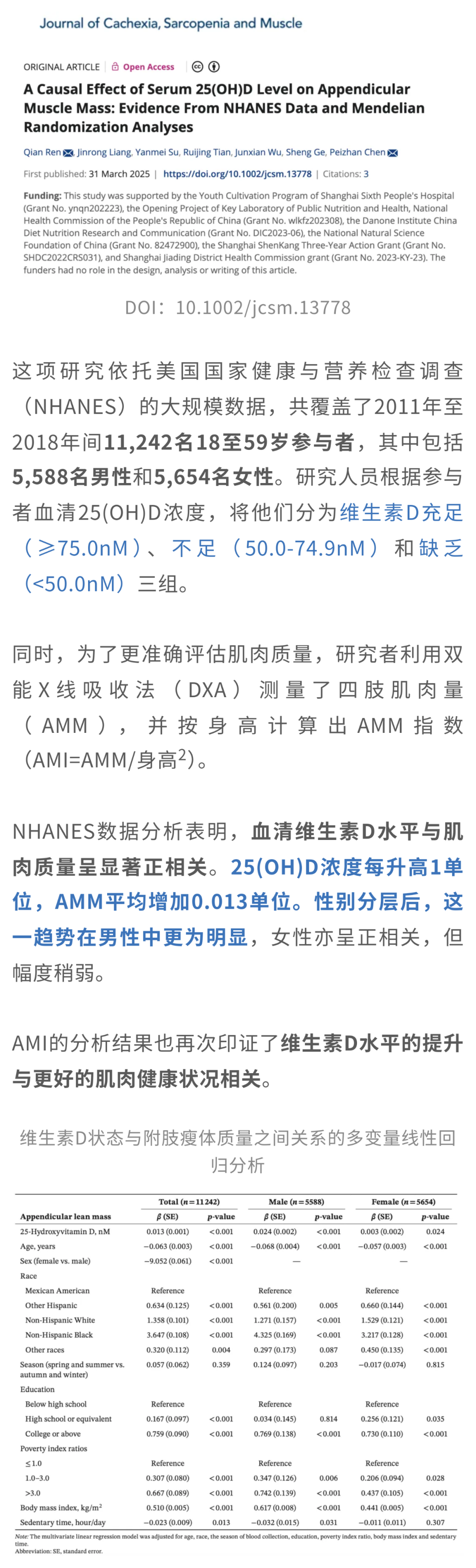 [3]Ren Q, Liang J, Su Y, Tian R, Wu J, Ge S, Chen P. A Causal Effect of Serum 25(OH)D Level on Appendicular Muscle Mass: Evidence From NHANES Data and Mendelian Randomization Analyses. J Cachexia Sarcopenia Muscle. 2025 Apr;16(2):e13778. doi: 10.1002/jcsm.13778. PMID: 40162558; PMCID: PMC11955837.