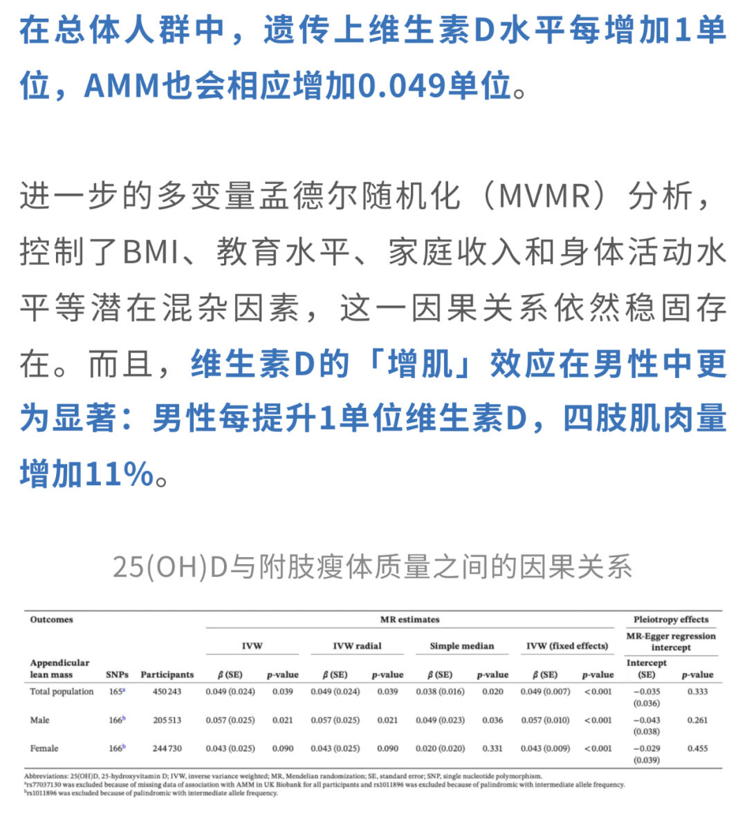所谓「能者多劳」,维生素D竟还能扎根在「肌肉」这块地里,卖力「干活」。上海交通大学的研究团队一项发表于Journal of Cachexia, Sarcopenia and Muscle的研究[3]从因果角度证实了「阳光维生素」在维持肌肉健康中的积极作用。他们发现,维生素D水平越高,肌肉质量也越好。血清25(OH)D每升高1单位,四肢肌肉量可增加0.049单位。这一效果在男性身上尤为显著:男性每提升1单位维生素D,四肢肌肉量增加11%。