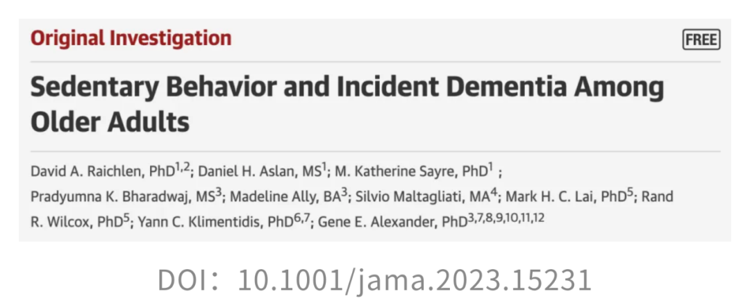 [1]Raichlen DA, Aslan DH, Sayre MK, et al. Sedentary Behavior and Incident Dementia Among Older Adults.JAMA. 2023;330(10):934–940. doi:10.1001/jama.2023.15231