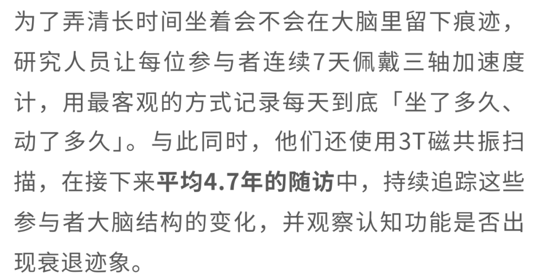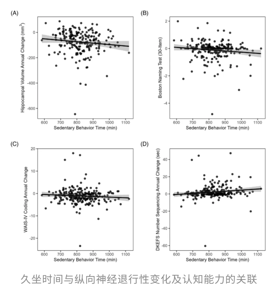 随着时间推移,更进一步的纵向追踪结果显示,久坐时间越长,海马体萎缩得越快。海马体是掌管记忆与学习的「核心枢纽」,它的体积下降往往是认知衰退的早期信号。同时,这些参与者的认知表现出现了更明显的下滑,他们在「命名」任务中更容易出现「眼熟却叫不出名字」的情况,在「处理速度」测试中反应也变得更慢。