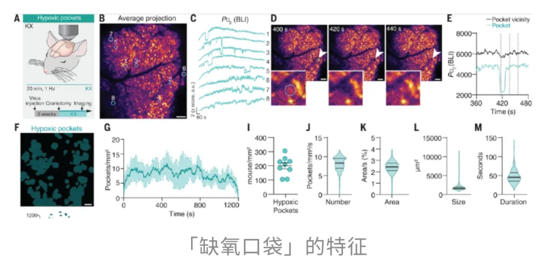 他们发现,即使小鼠处于静息状态,大脑皮层内的氧含量也会骤降,然后又在几秒到几分钟内迅速恢复。这种边界清晰、突发又短暂的局部低氧事件往往局限在非常小的区域,形状也像个小气泡,研究人员形象地将它们称为「缺氧口袋」。