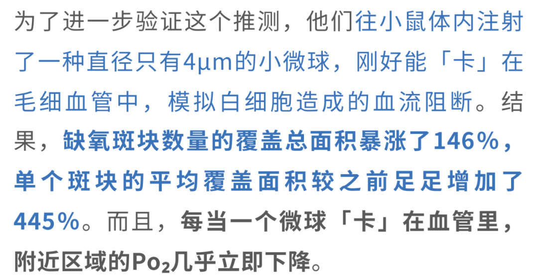 研究者推测,大脑中毛细血管的微循环受阻是导致「缺氧口袋」出现的「罪魁祸首」。当某些白细胞「赖」在毛细血管中不肯「走」时,就会阻挡红细胞的正常通行。而红细胞又是运氧的主力,一旦它们「卡」在半路,氧气就无法被及时送到大脑组织,某个区域也就陷入了短暂的「断氧」状态。
