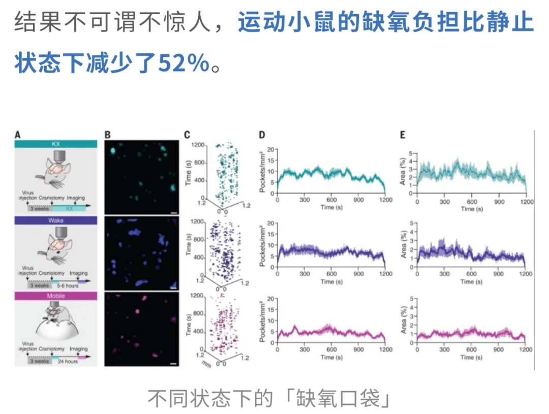 此前,发表于Science的一项研究[3]便清晰地捕捉到了大脑皮层在自然生理状态下的氧张力(Po₂)变化过程。这项研究表明,即使在「休息」状态下,大脑也并非始终处于充分供氧的「理想状态」。在清醒时,小鼠大脑皮层中会频繁自发出现许多短暂且局限的「缺氧口袋」,它们持续几秒到几分钟不等。不过,跑步等体育活动可显著降低这类缺氧事件的发生频率,减少幅度高达52%。