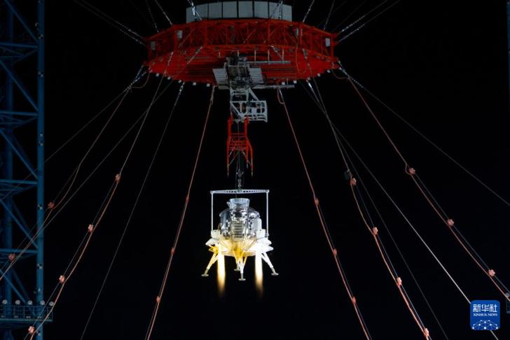 在地球上模拟月球环境是一大难题。试验场通过塔架、钢缆等组成的随动系统,来模拟月球表面的微重力环境,并实时跟踪登月舱的飞行轨迹。由于测试是在地球表面进行,必须通过这些特殊装置来模拟月面重力场,以满足测试条件。同时,测试场地的地面也按照月球表面的环境特点进行针对性的设计和部署,不仅设置了模拟陨石坑,还铺撒了类似月壤的岩石碎粒,尽可能真实地还原月球表面的地形特征。这些精心设计的细节,为着陆器提供了最接近真实的试验条件,确保测试结果能够真实反映其在月面的表现。