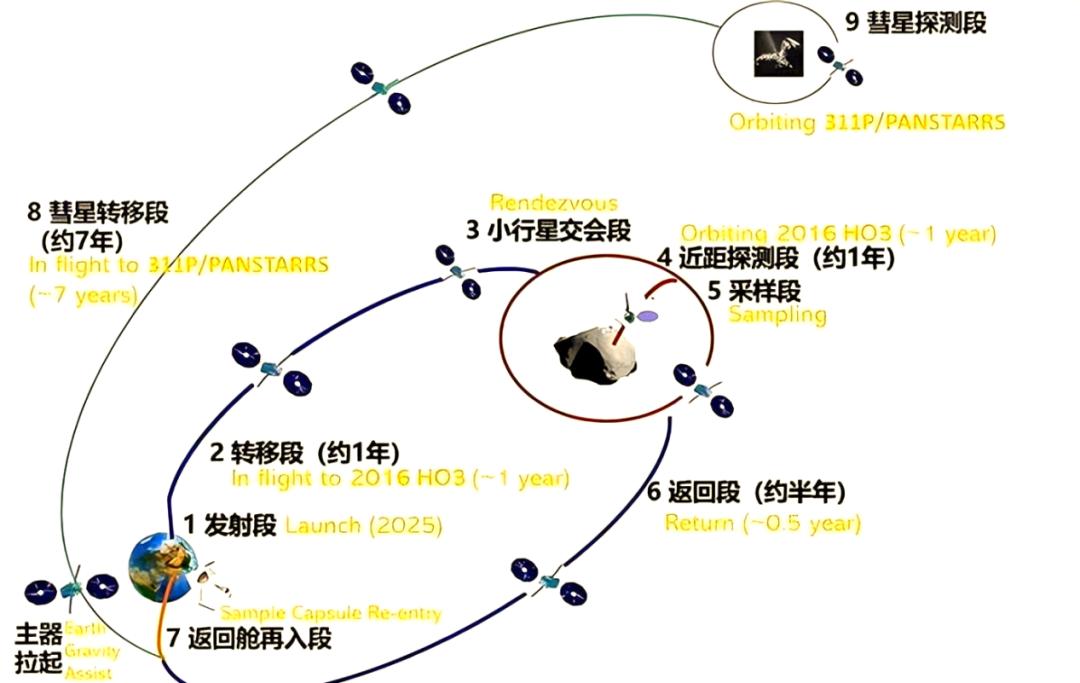 其中包含了,测定2016 HO3轨道参数、自转参数、形状大小和热辐射等物理参数,研究地球准卫星的来源和轨道动力学演化,探测2016 HO3形貌、表面物质组分、内部结构,获取小行星样品的背景信息等等,然后再开启相关性的采集样品返回。
