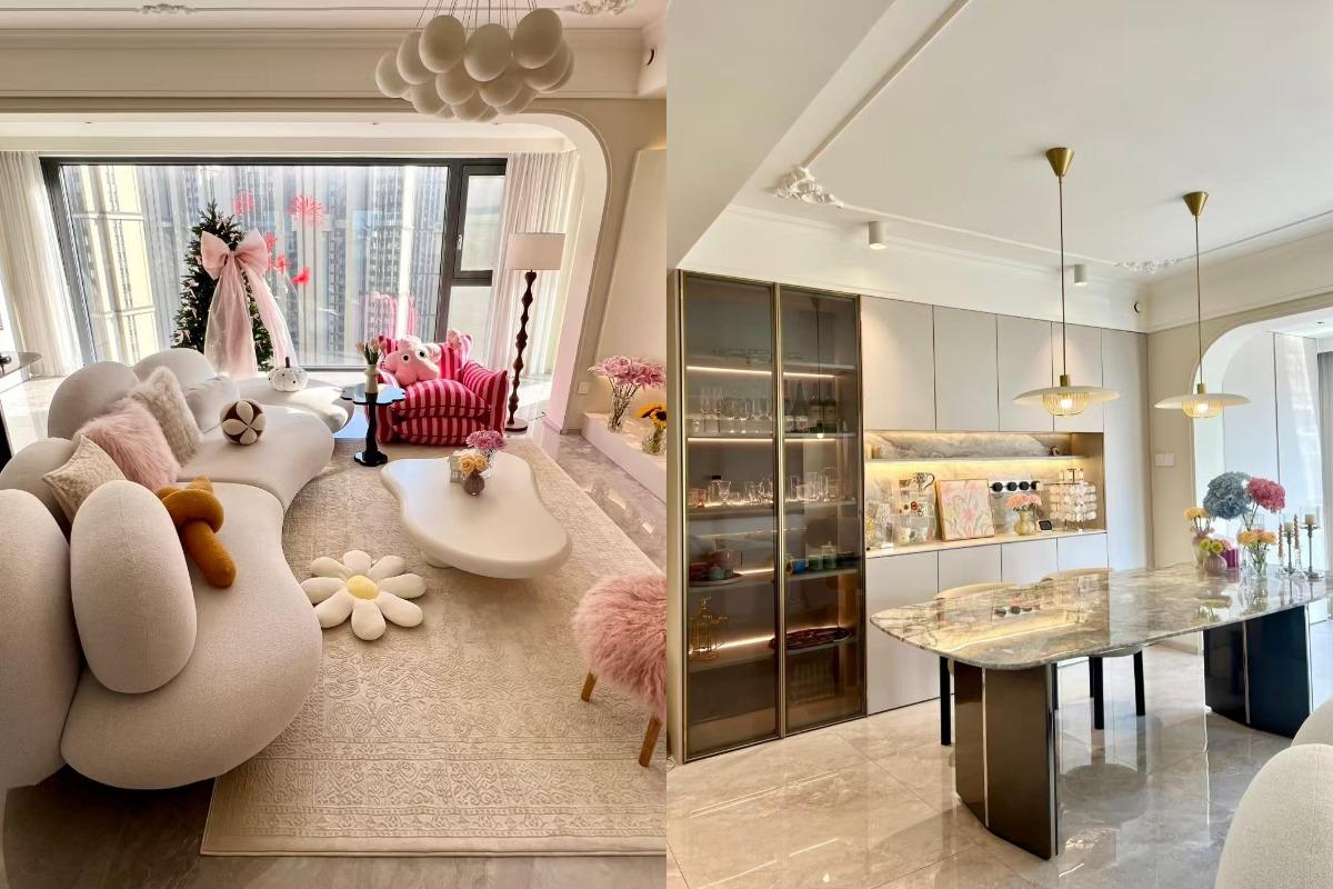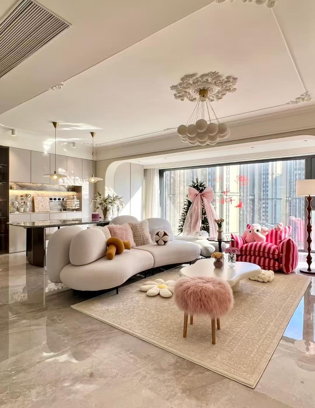网友@丫丫说,我家是法式奶油风,客厅、餐厅和阳台打通后形成一个大横厅,不光空间感敞亮,最重要的是我家真的很出片。