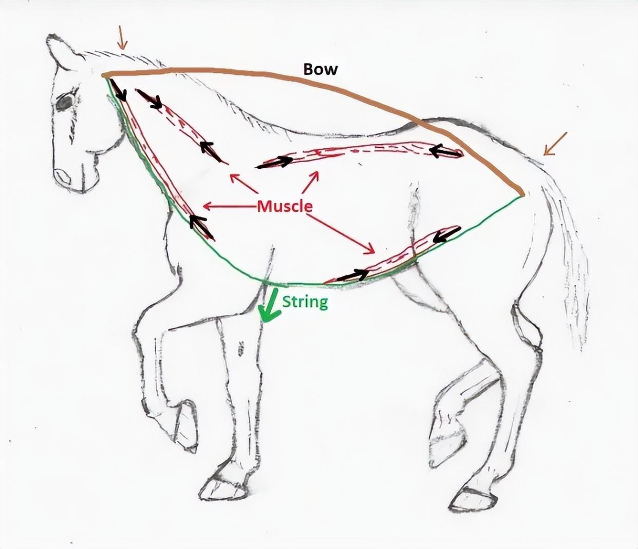 我们可以先看一下马的脊柱。1946年,生物学家斯利珀(E. J. Slijper)提出了著名的“弓与弦”理论来解释马的背部结构。马的脊柱像是一张硬弓,腹部的肌肉则是弦,这种刚性结构能够承受垂直方向的载荷,也就是骑手的体重。