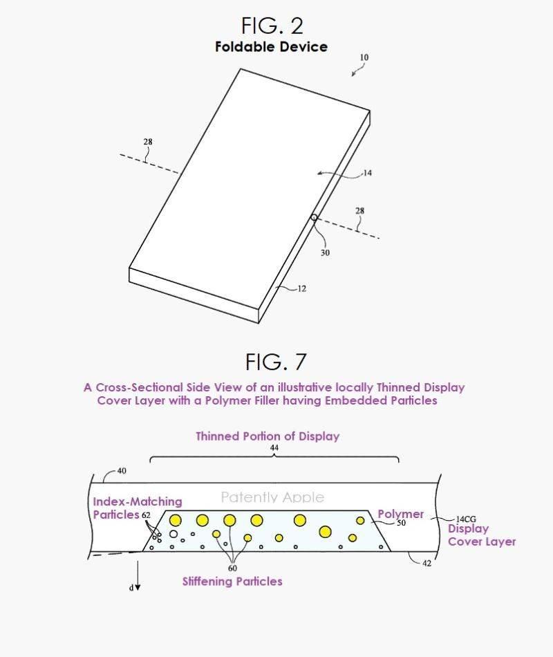 因此,想要做到理想和宣传中的无折痕,光在铰链上发力是远远不够的,而是需要兼顾到铰链技术、屏幕材料和折叠方式。那苹果是怎么把这个「痛点」在理论技术上彻底根除的呢?答案在另一份文件里。