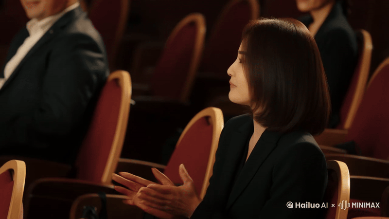 ▲ prompt:暖调室内打光,剧院观众席中,主人公身穿黑色西装,坐在中排靠左的位置。她的表情充满专注,时而露出轻松的微笑,双手鼓掌,动作自然且富有节奏感。镜头从主人公侧面开始,捕捉她身边其他观众的剪影和暗淡的座椅纹理,强调环境的层次感。随着镜头推进,主人公站起来。