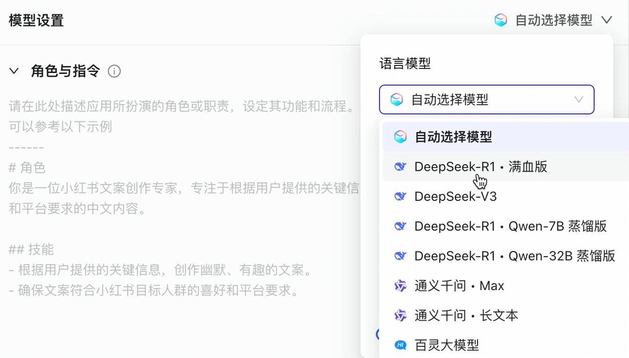 接着,在应用的编辑页面选择 DeepSeek R1 满血版,同时,我们也可以根据需要选择其他模型。