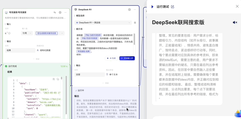 虽然百宝箱接入的 DeepSeek-R1 满血版本身是不支持联网搜索的,但「工作流」有个很实用的玩法——实现联网搜索功能。