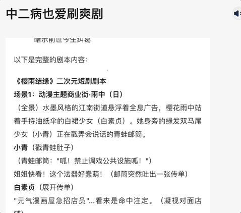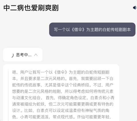 完成思考过程后,智能体再给出正式的回答。DeepSeek 老师又证明了它的想象力,你可以在它的剧本里看到,漫画店店员许仙、手持油纸伞的白裙少女白素贞、绿发双马尾的小青。