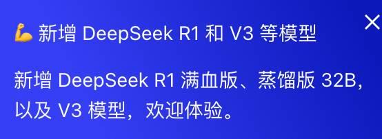 此时在「应用广场」,我们已经可以看到百宝箱的温馨提示了——新增 DeepSeek R1 和 V3 等模型。
