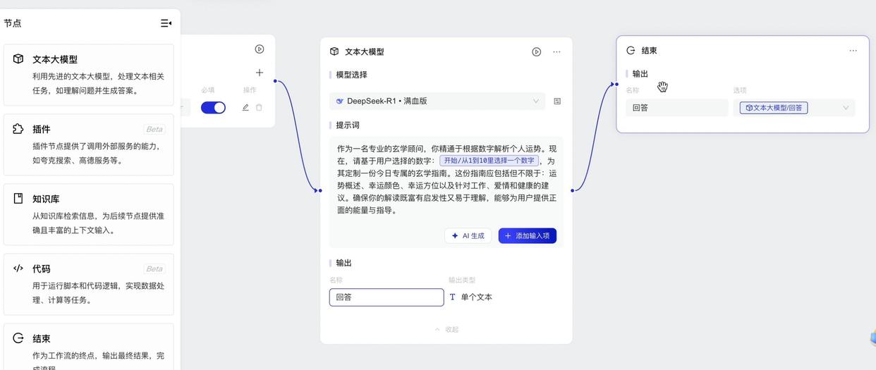 然后插入「文本大模型」节点,在「模型选择」中选择 DeepSeek R1 满血版,也可以切换其他模型。