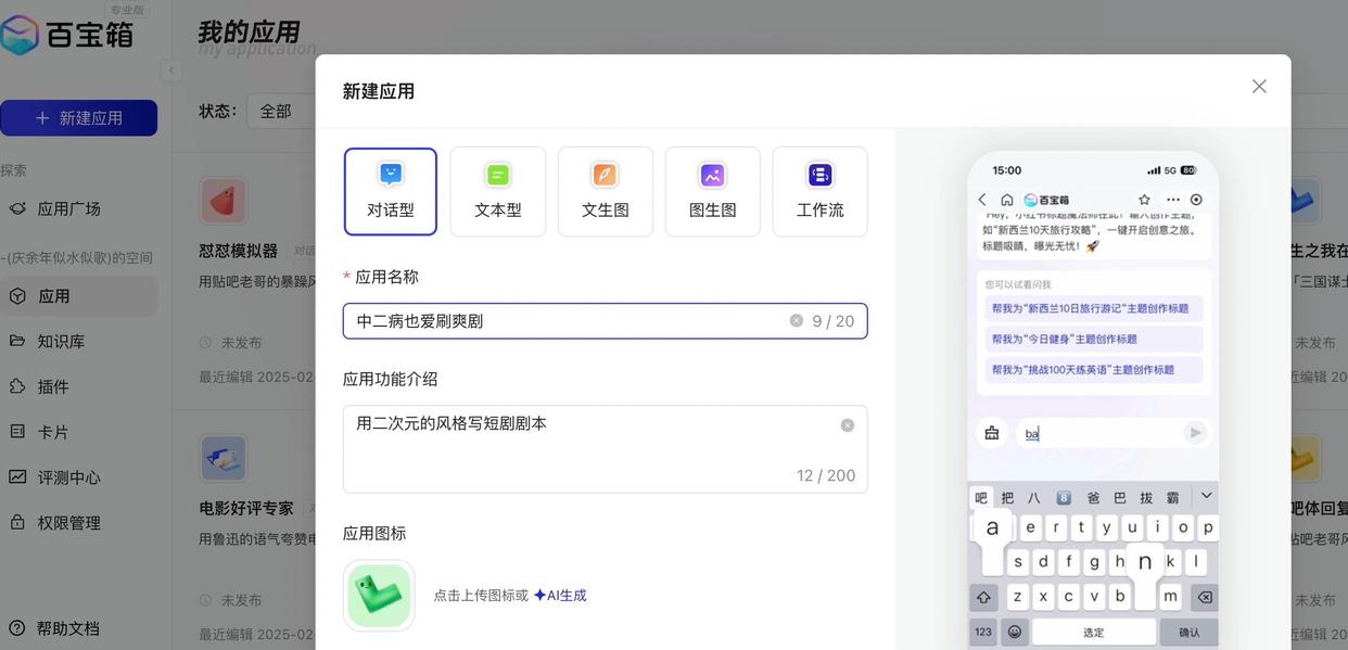 这次,我想让百宝箱帮我做一个叫作「中二病也爱刷爽剧」的智能体,给它一个主题,它可以用二次元的风格写出短剧剧本。