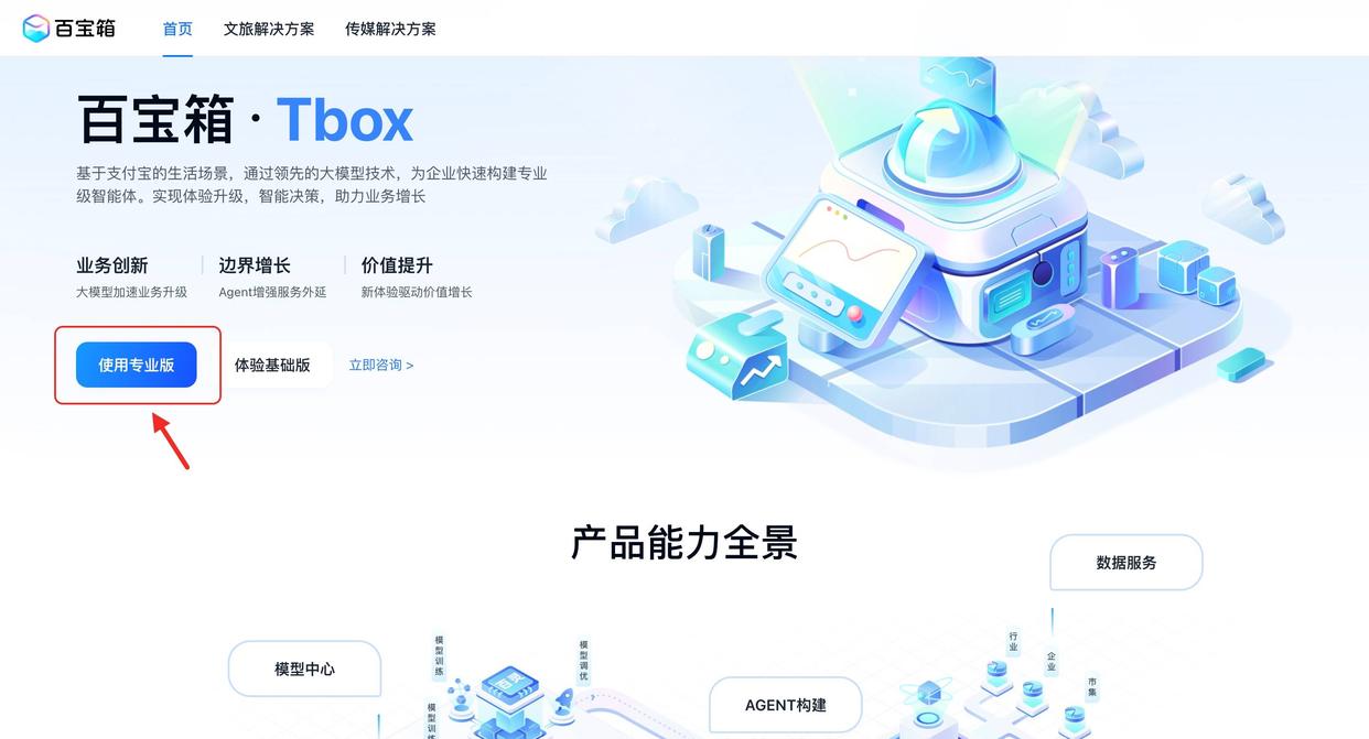 首先,登录百宝箱智能体开发平台(tbox.alipay.com),点击「使用专业版」。
