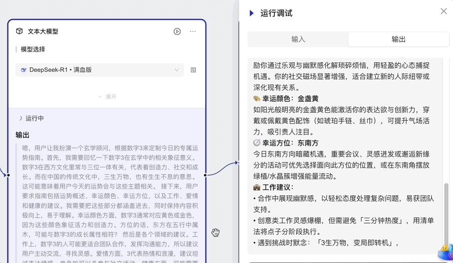 除了「对话型」应用,百宝箱的「工作流」应用也支持接入 DeepSeek 模型,它可以通过可视化的方式,对文本大模型、知识库、插件等功能进行组合,实现复杂、稳定的任务流程。
