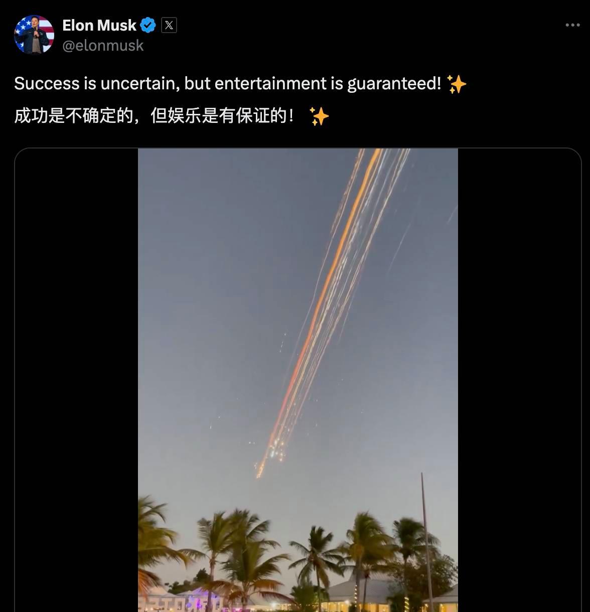 马斯克转发了解体的画面,并配文:「成功是不确定的,但娱乐是有保证的!」