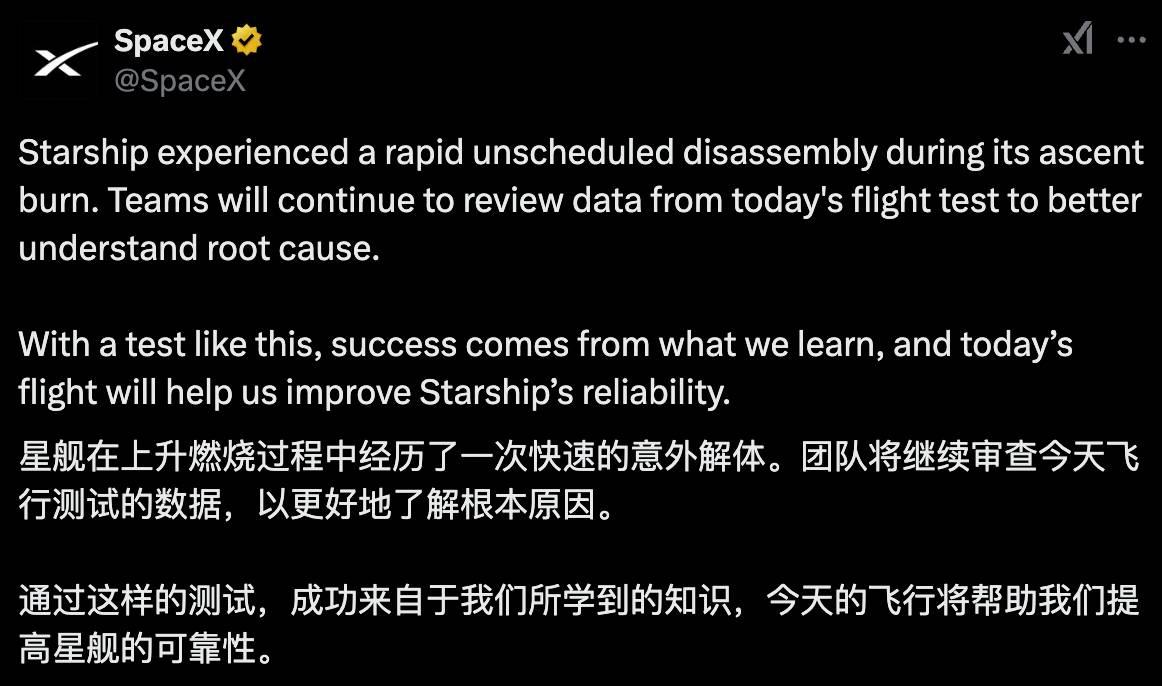 SpaceX 随后说明:「星舰在其上升燃烧过程中经历了一次快速的非计划解体。」