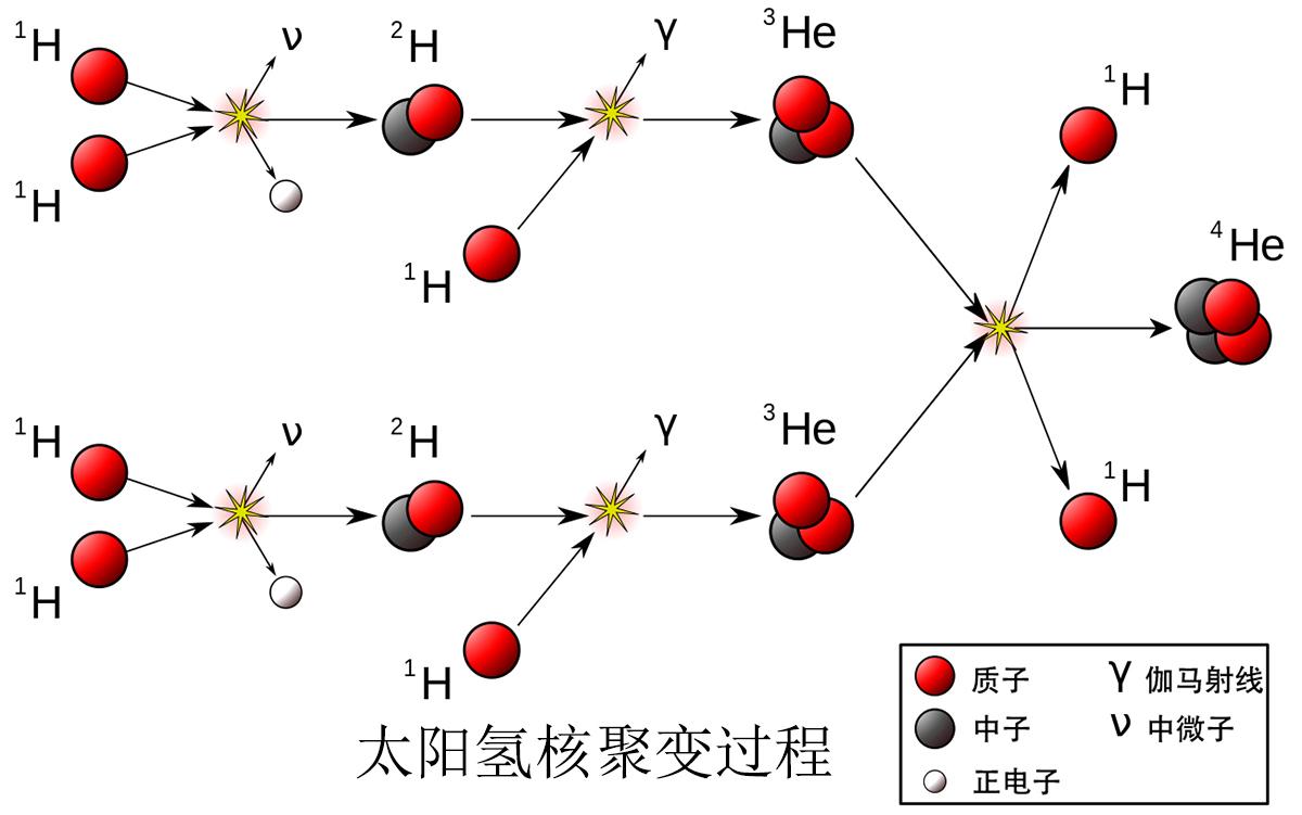 太阳已经“燃烧”了46亿年,其源源不断的能量之源在于核心区域的氢核聚变反应。在1500万度高温和2615亿个地球表面大气压的作用下,四个氢原子核相互碰撞结合成一个氦原子核,反应前后出现了质量亏损,一部分质量被转变成能量释放出来。