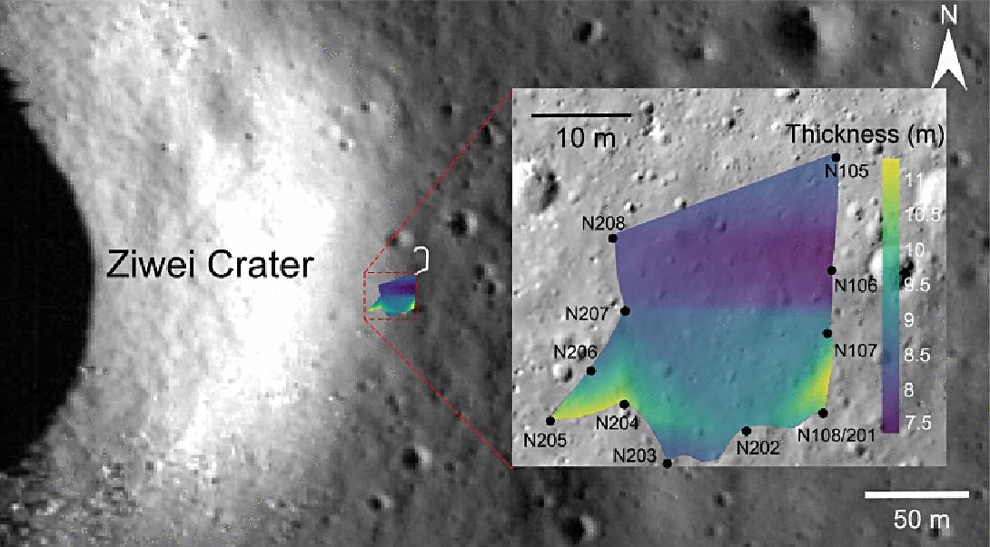 根据我国科学家发表于《IEEE应用地球观测和遥感专题期刊》(IEEE Journal of Selected Topics in Applied Earth Observations and Remote Sensing)的一项研究,通过玉兔号的高频雷达观测数据,科学家分析了广寒宫月表土壤的厚度分布。根据月壤中二氧化钛的含量,确定了月表氦-3的浓度。
