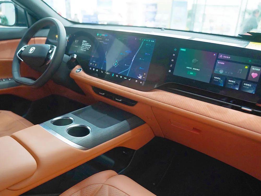 另外就是座舱部分,第四代CS75 PLUS也把体验提升到了越级水准。首先,车辆采用了一个37寸一体式三联屏设计,从观感上就给到极强的科技感;而实际体验时,这三个屏幕之间的交互也十分便利,导航信息可通过三指飞屏分享给主驾屏幕,中控与副驾之间的娱乐功能也能在两个屏幕之间无缝流转。